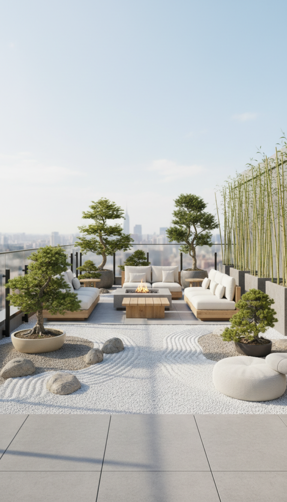 Sometimes less truly wins. A Zen style rooftop corner with pebbles, bonsai, and low plants creates instant calm without heavy maintenance.