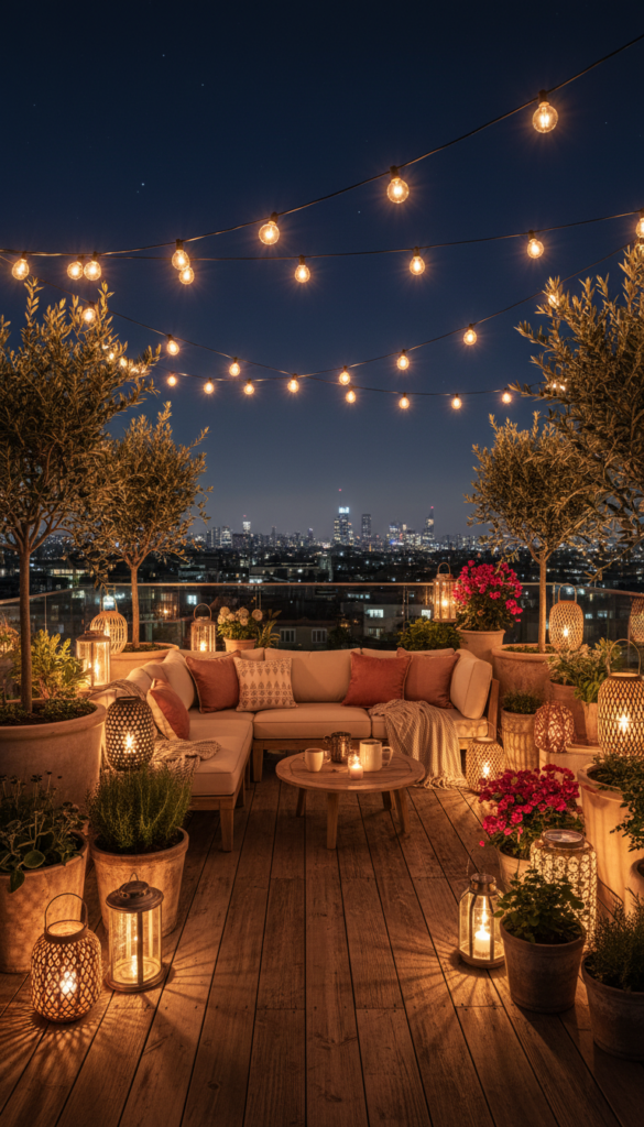 Lighting changes everything. Warm string lights or solar lanterns instantly shift a terrace from basic to magical evening hangout.