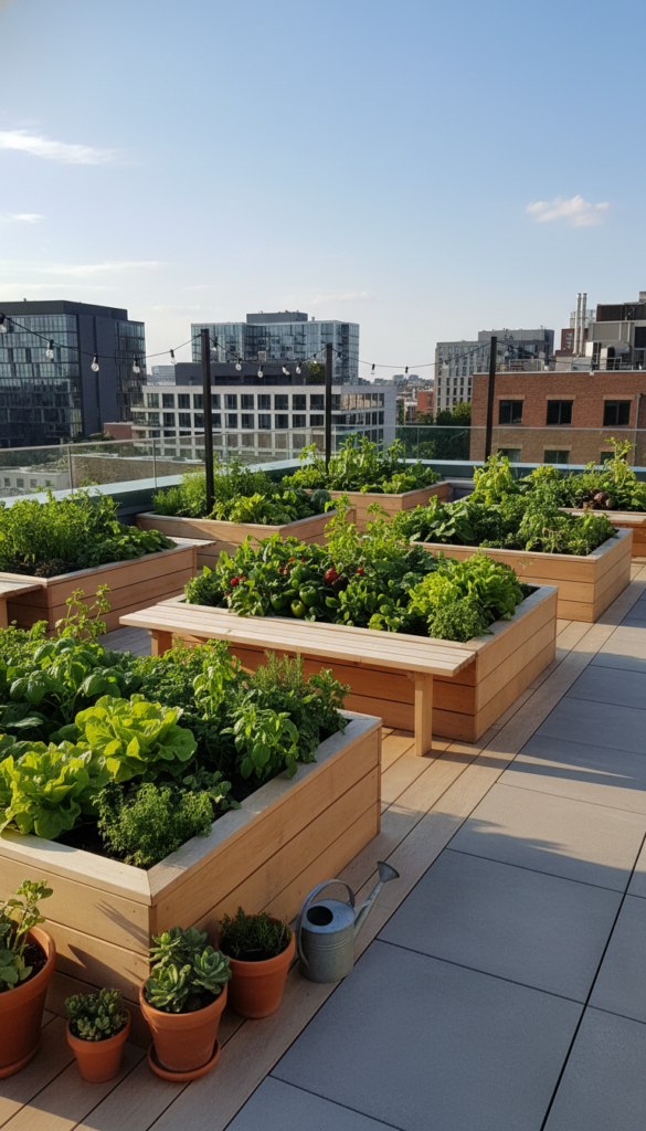 Urban rooftop gardening often focuses on edible plants because fresh produce, stress relief, and cost savings motivate people strongly.