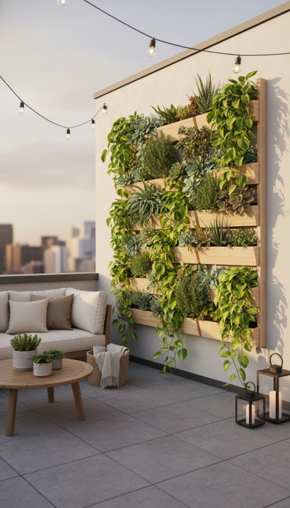 Short on floor space? Vertical gardens solve that instantly. Wall mounted planters or railing pockets create greenery without stealing walking space, which rooftop patios desperately need.