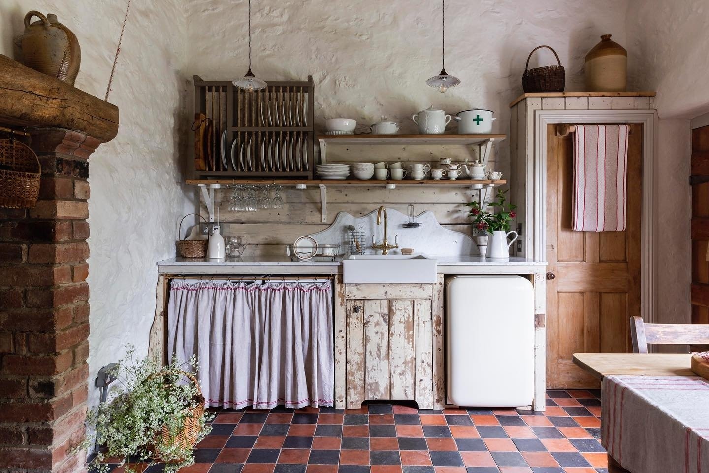 Worn textures and time-loved finishes give this kitchen its soulful cottage personality. The chipped paint on the under-sink cabinetry, paired with red-striped linen curtains, brings an organic, lived-in quality that instantly feels welcoming. A farmhouse sink sits beneath a wood shelf filled with classic white ceramics, while hanging pendants add gentle, ambient lighting. Clay jugs, baskets, and exposed brickwork round out the earthy tone of the space. The checkerboard tile floor keeps things rooted in tradition while allowing the natural imperfections to shine.