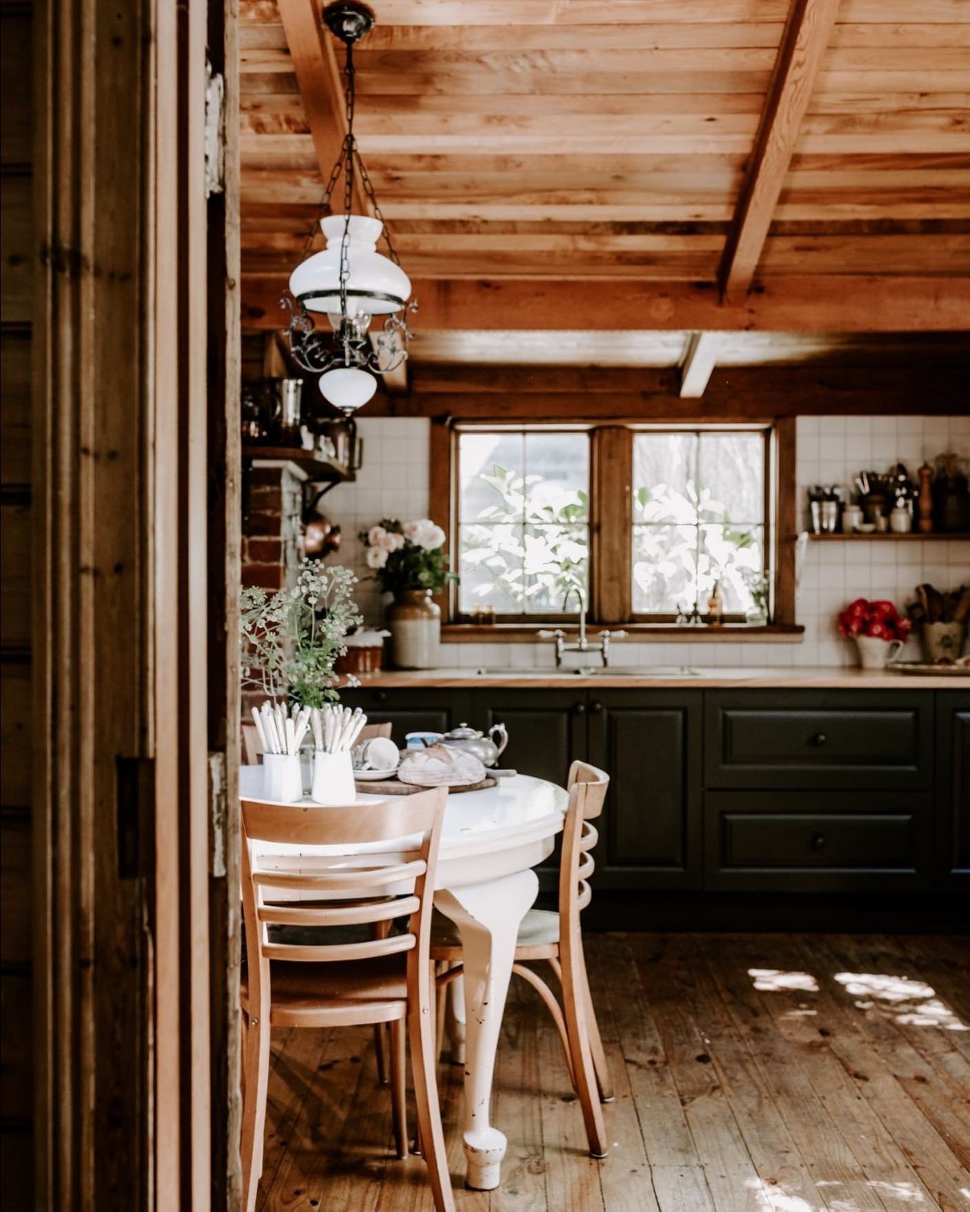 Warm wood ceilings, vintage lighting, and cozy window views come together in this earthy cottage kitchen. The dark lower cabinets provide a rich base, while white tile and wooden windows brighten the space. A small round table in the center, surrounded by classic wooden chairs, makes it perfect for intimate tea moments or quiet breakfasts. Wildflowers and copper pans bring a soft rustic energy that feels straight out of a storybook. This kitchen captures the quiet charm of countryside living.