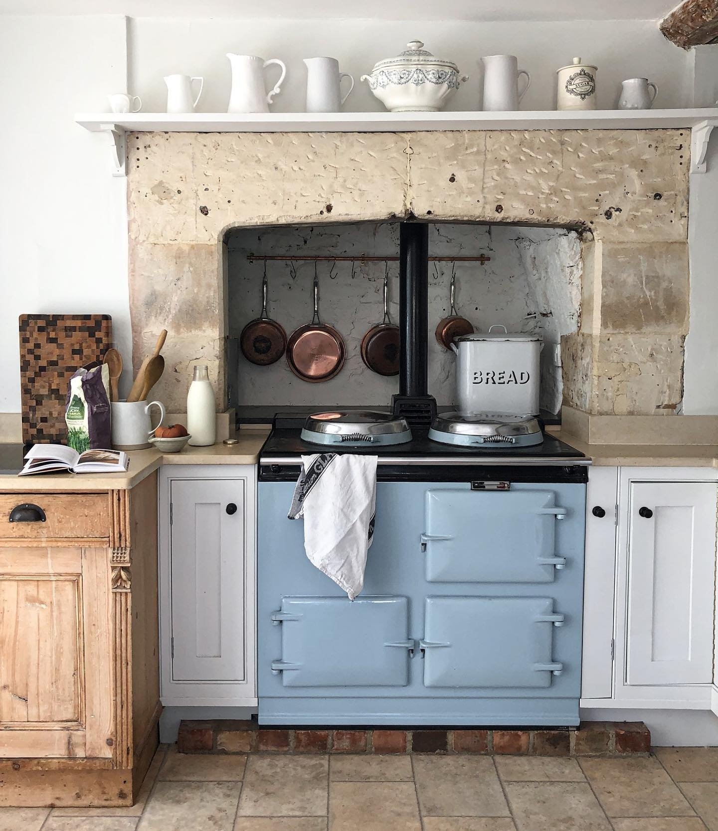 There’s undeniable charm in pairing raw textures with soft color. This blue range cooker, nestled inside a weathered stone alcove, creates an instant focal point. Above it, polished copper pots add shine and history, while the open shelf of white ceramics softens the look. The balance of materials—stone, metal, and ceramic—gives this kitchen its timeless feel. It’s a perfect blend of English countryside inspiration and practical cottage living, ideal for those who love warmth with a gentle color palette.