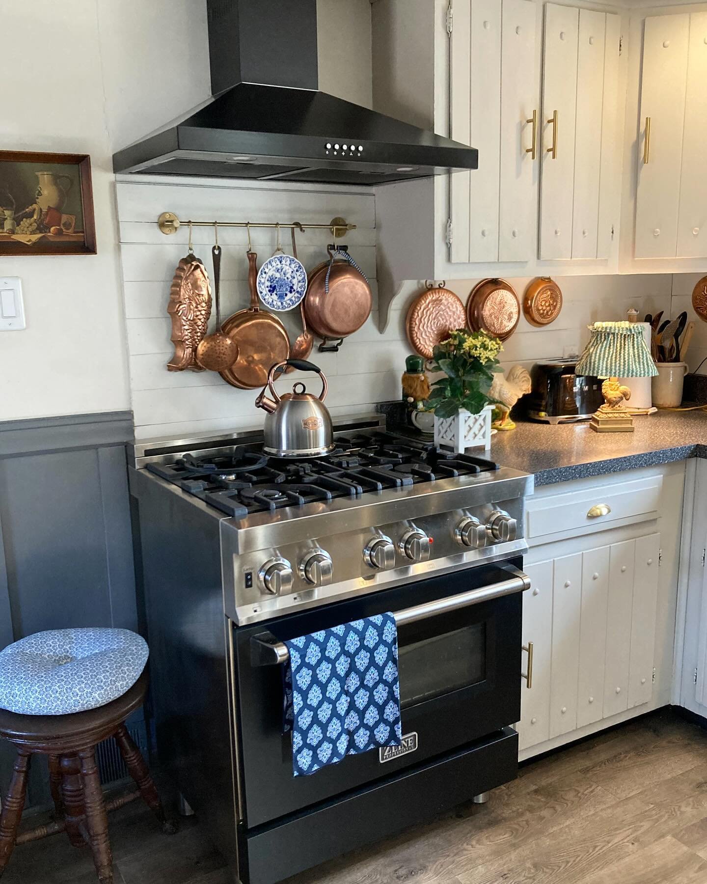 This setup is pure cottage warmth. Copper cookware takes center stage, hung neatly above a sleek black stove that adds a touch of modern contrast. A soft blue patterned towel introduces a cozy, homey feel while balancing the deeper tones in the space. The countertop features a classic ceramic lamp—an unusual but beautiful touch that adds intimate lighting. This kitchen proves that even in a small space, thoughtful layering of metal finishes, soft fabrics, and functional styling can make every inch feel comforting and lived-in.