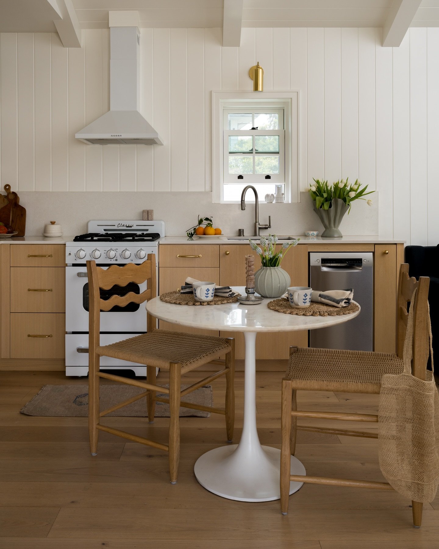Light-filled and minimal, this kitchen leans into the Scandinavian side of cottage design. Clean paneling, blonde wood cabinets, and a tulip table with woven chairs create an easy, open feeling. The white retro-style stove and matching vent hood add a nostalgic edge, while green tulips and fresh fruit offer natural color. Despite its simplicity, the space feels full of life—ideal for anyone who values a calming environment without sacrificing charm.
