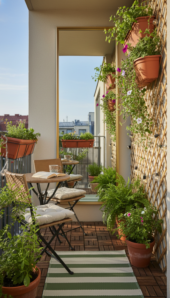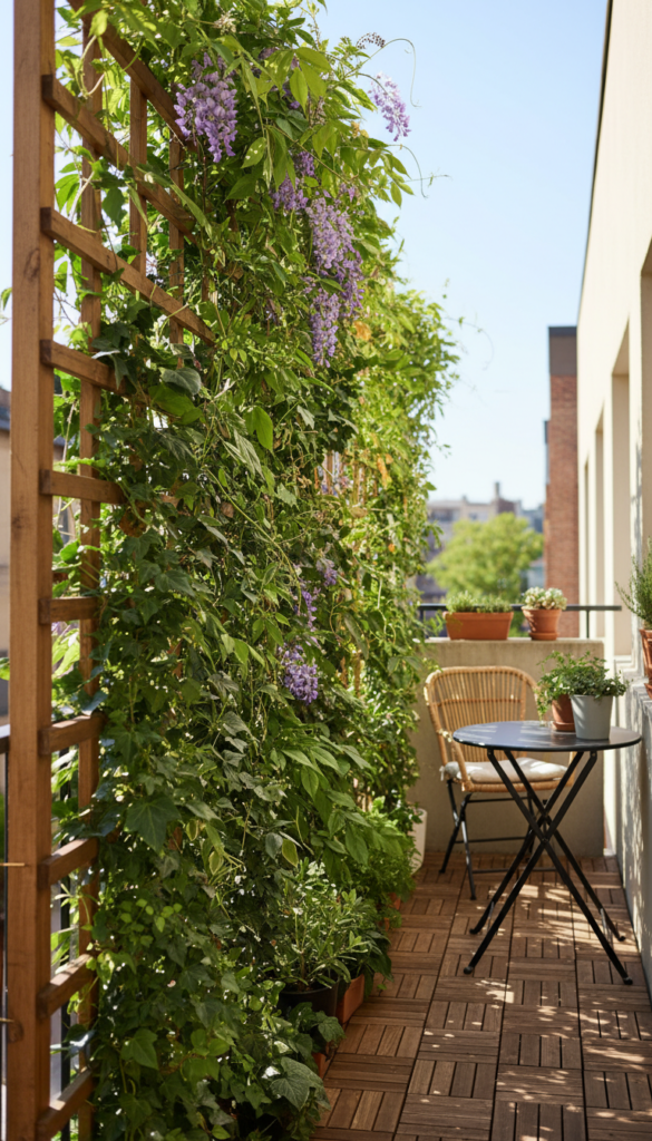 Stick trellis panels along the railing or wall and train those climbers up and across. Soon you’ve got a leafy curtain that moves with the breeze, adding softness and dimension to your balcony decor. This is perfect if you need that little cocoon feeling without losing light or airflow.