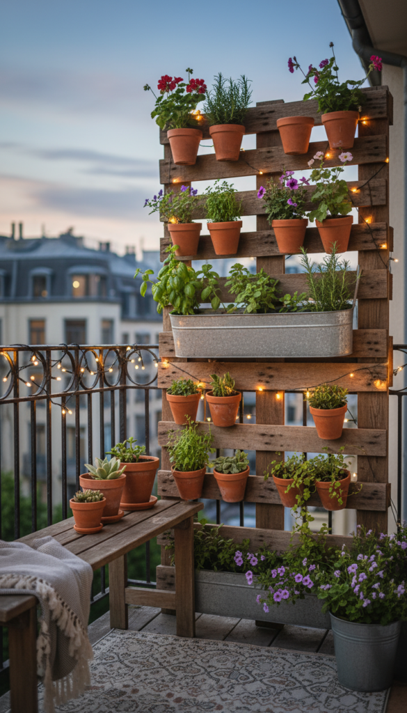 It’s rustic chic and so cost-effective. You can paint it a bold color or keep it raw for that earthy, boho feel. Pallet gardens work with herbs, flowers, or even vertical veggies so you’re essentially making a whole green tapestry right on your balcony wall. It’s like outdoor art that grows.