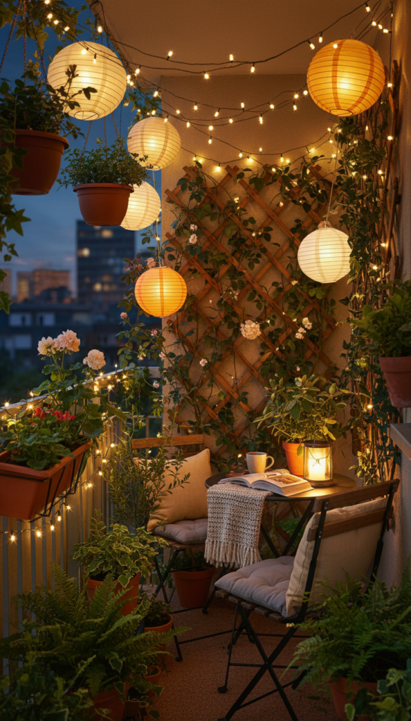 Garden decor isn’t just daylight stuff. String fairy lights or hang lanterns to make your balcony feel enchanting at night. Wrap them around railings, drape across plants, or let them peek from beneath shelves. Lighting adds ambiance instantly and makes your space feel cozy enough to linger late. It’s like turning a tiny garden into a romantic outdoor room without breaking the bank.
