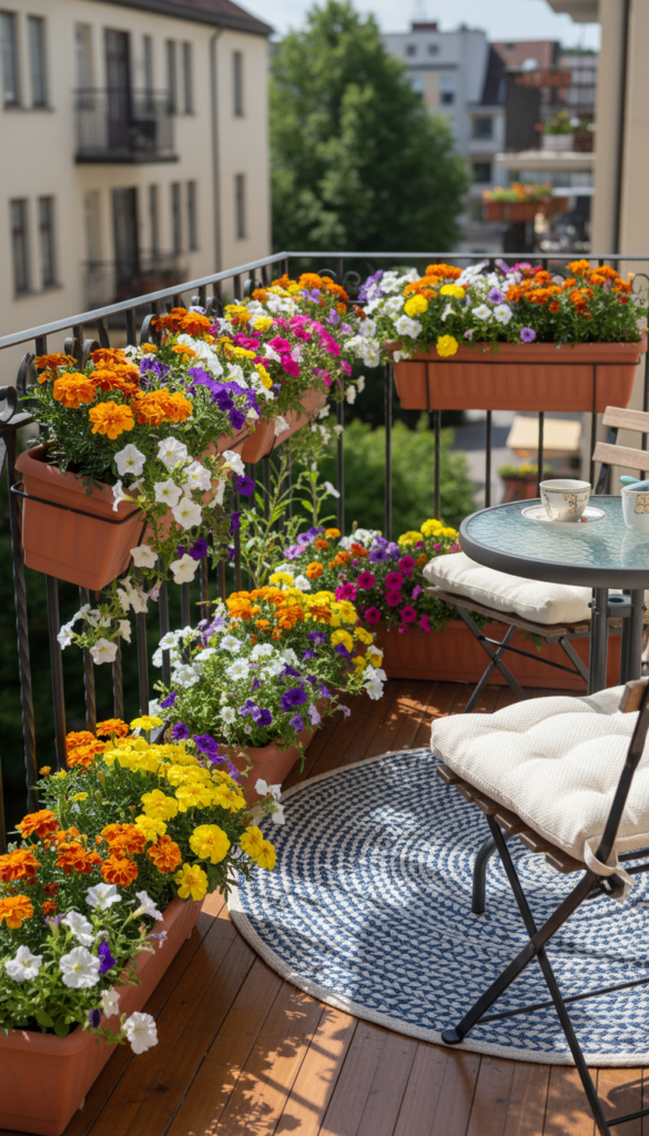 Those railings aren’t just safety bars; they’re your balcony garden catwalk. Slap on some railing planter boxes filled with flowers like marigolds, petunias, or begonias and suddenly your balcony looks blooming. Tripod hooks or adjustable brackets make this easy, and you get splashes of colour without losing precious floor or wall space.