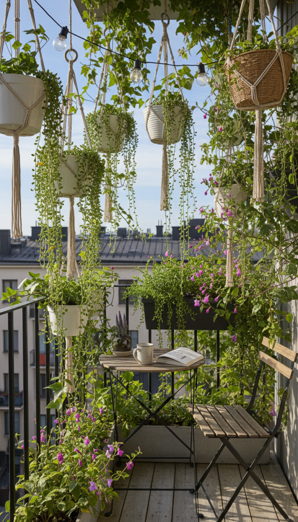 Nothing says “balcony retreat” like a tiny bistro table flanked by two chairs nestled among your plants. This idea blends patio decor and garden vibes so effortlessly.