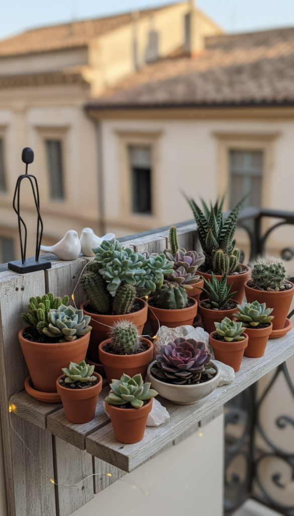 Succulents and cacti are little green ninjas: low-maintenance, tactile, and adorable. A mini garden of them in assorted cute pots gives your balcony a modern succulent tableau that’s easy to love. Mix heights, colours, and textures maybe add painted stones or a tiny statue for personality.