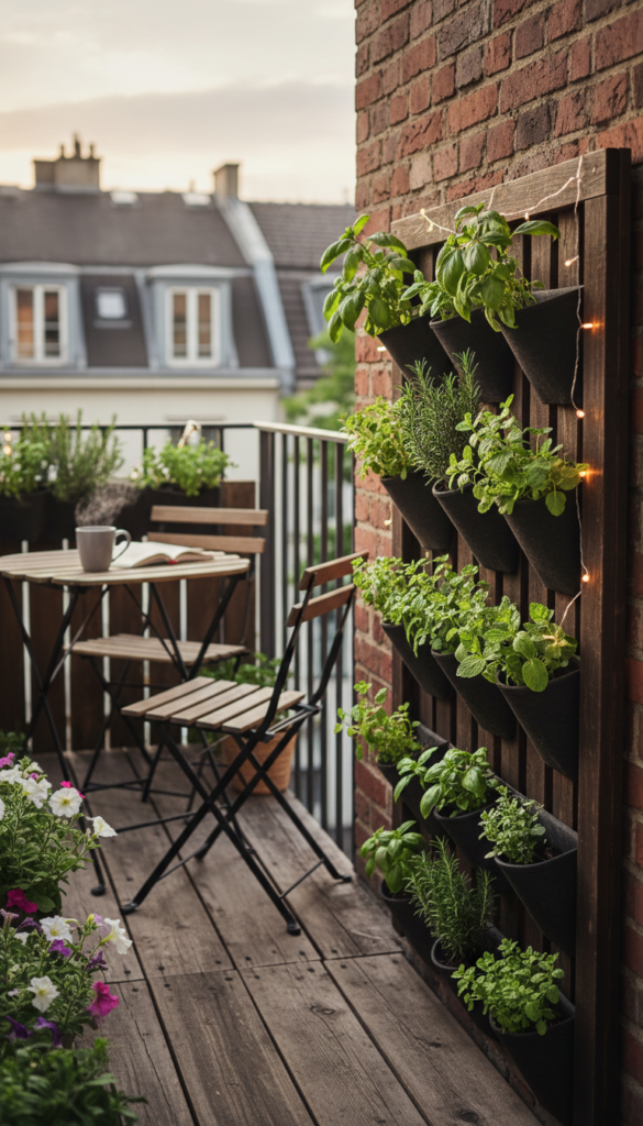 Imagine walking out your balcony, brushing past a towering herb wall that smells like fresh basil and mint. It’s a vertical mural of green that grabs eyeballs without eating floor space, perfect for tiny balcony garden setups.