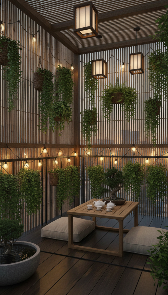 If your balcony feels exposed, a bamboo screen is your best friend. It adds privacy while doubling as beautiful texture. Bamboo instantly brings warmth and an organic look that fits perfectly with Japanese garden decor ideas. It also helps define your space and make it feel more like a room.