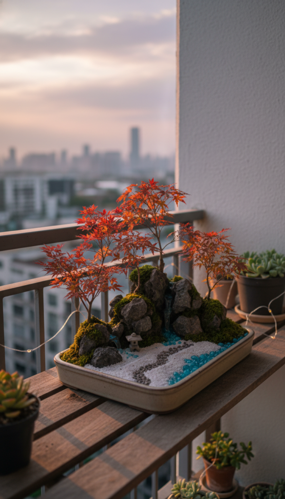 Bonsai and saikei gardens are living art. A bonsai tree or a miniature landscape tray can become the centerpiece of your balcony. It adds detail, craftsmanship, and storytelling to your space.