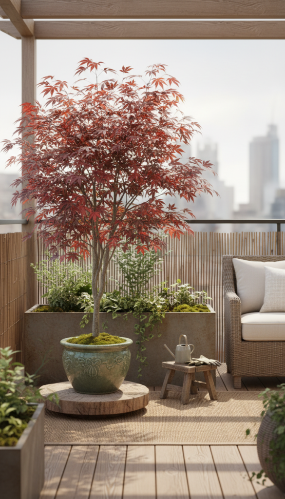 A Japanese maple instantly elevates your balcony. Its leaves add elegance and seasonal beauty, even in a pot. Choose a container that feels earthy like ceramic or stone.