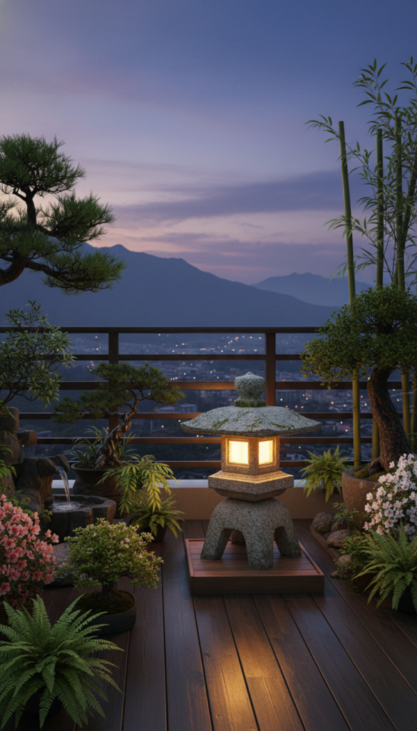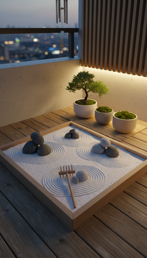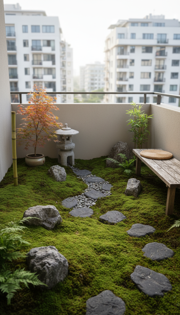 A tsubo-niwa is a tiny courtyard garden concept that works perfectly for balconies. Choose a small corner and treat it like its own mini landscape. Use moss, stones, and one or two simple plants like ferns or dwarf bamboo. Less is more here.