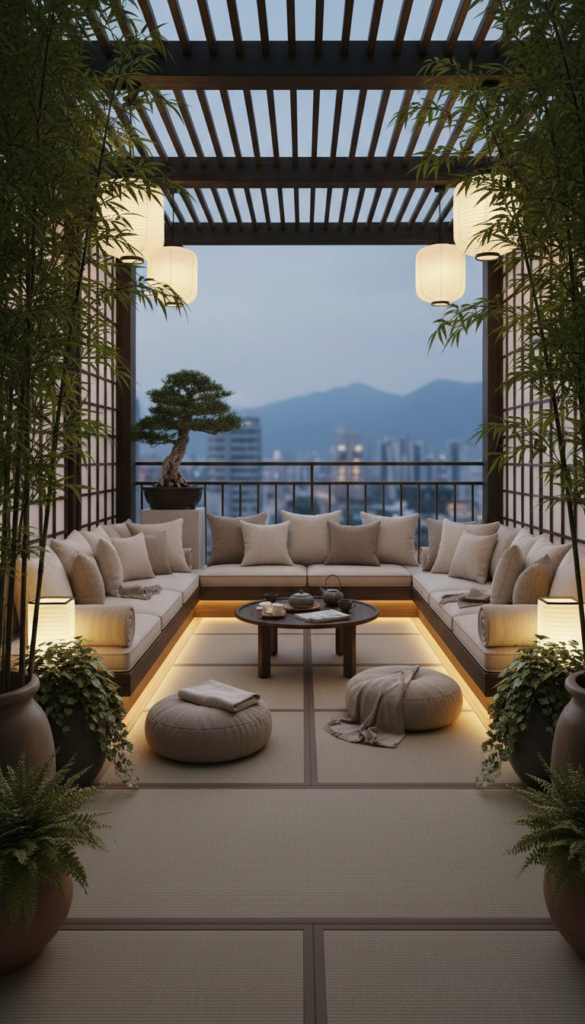 Low seating is pure Japanese design magic. It instantly grounds your balcony and makes it feel cozy and intentional. A short wooden bench, floor cushions, or tatami-style mats create a space that invites relaxation. Choose earthy tones like beige, olive, and muted browns for a natural look.