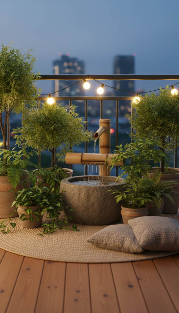 Water brings life into any garden, and a mini bamboo fountain does it in the most soothing way. Even a tiny trickle of water can completely change the mood of your balcony. A small bamboo spout flowing into a stone bowl creates that peaceful sound that makes the space feel like a spa. It masks city noise and adds instant tranquility.