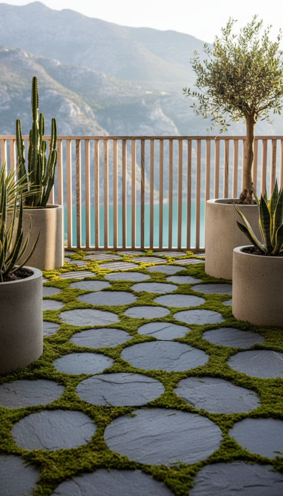Instead of artificial grass, go for real texture with moss or low ground cover plants. Moss feels soft, organic, and beautifully imperfect. It works great between stepping stones or in shallow trays.