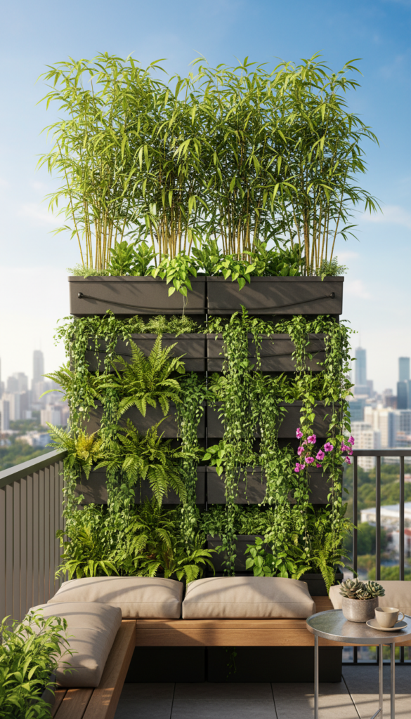 A vertical garden saves space and adds drama. Use wall planters or hanging systems with ferns, bamboo, and trailing plants. It turns your balcony into a lush green escape.